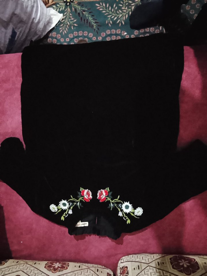 Düğmeli, straplez yakalı siyah bolero, kısa kollu ve nakışlı çiçek detaylarına sahip. Gotik ve bohem tarzını yansıtıyor.