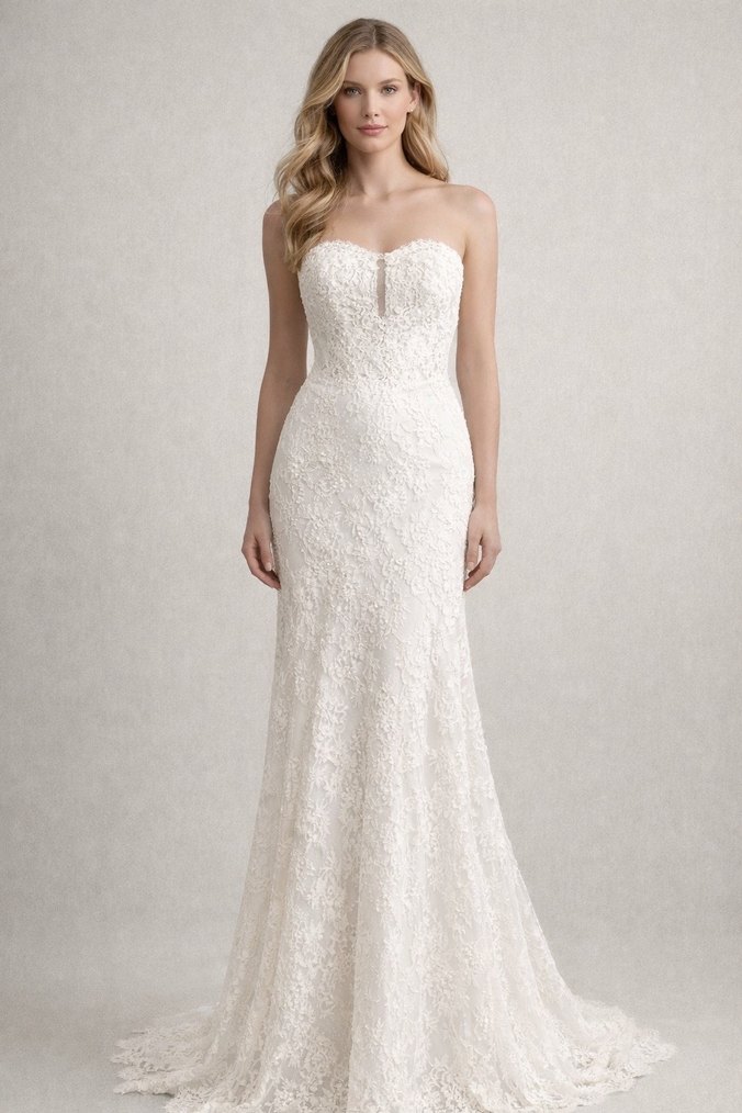 Beyaz straplez, uzun A kesim gelinlik, zarif dantel detaylarıyla. Minimalist ve modern klasik tarzda, regular fit ve kolsuzdur. Gelinlik için uygundur. Fransız dantel Kadıköy’de özel dikildi arkası ip bağlamalı olduğu için 38 bedenede olur duvağıda var oda verilecek