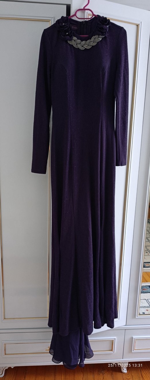 Koyu mor renkte, uzun kollu ve yüksek yakalı, drapeli tasarıma sahip dar kesim uzun abiye Minimalist ve gotik tarzda,göründüğü gibi temiz şık sadece yaka kısmında bir gülün yapışkanı kalkmış kolaylıkla yapıştırılabiliyor arka kısımda çok hafif bir sökülme var girmeme engel değil yani yine de belirtmek istedim