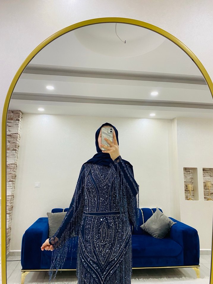 Yüksek yakalı, uzun kollu ve nakışlı lacivert abiye elbise. Drapeli tasarımıyla şık ve bohem bir görünüm sunar, düğünler için uygundur.