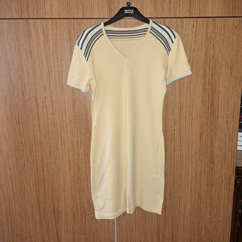 36 38 Bej renk, kısa kollu ve V yakalı triko elbise. Omuzlarda çizgili detaylar bulunur. Midi boy, yumuşak dokuma kumaştan yapılmıştır. Esnektir.