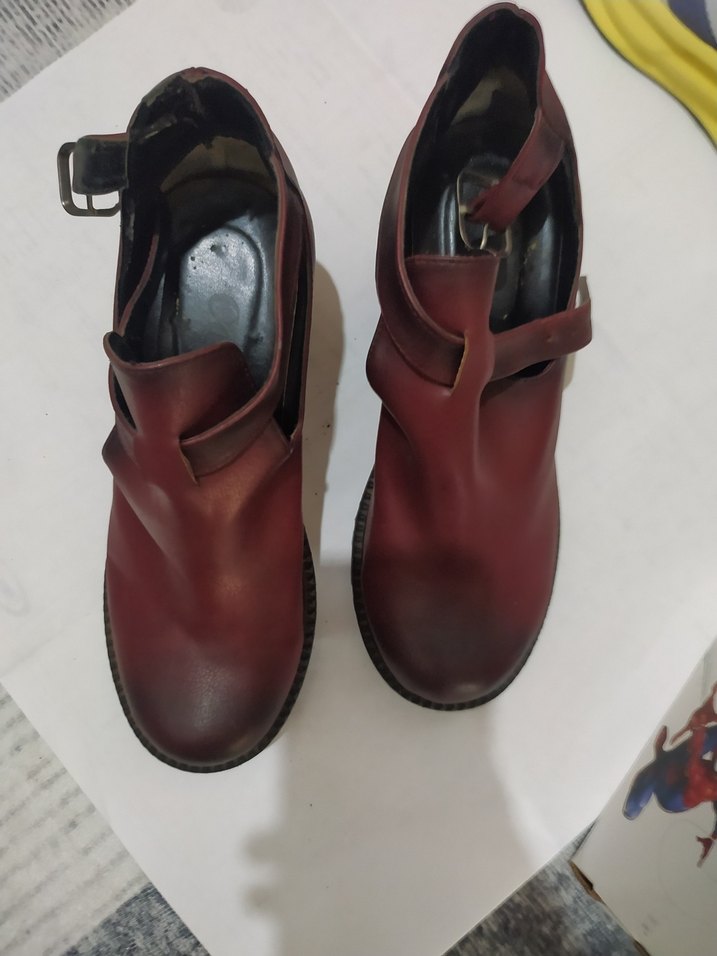 Bordo deri bot, kalın topuklu ve tokalı kayışlı, günlük kullanım için sağlam tabanlıdır. Kullanıma engel bir sorunu yoktur. Görsellerde görüldüğü gibidir.