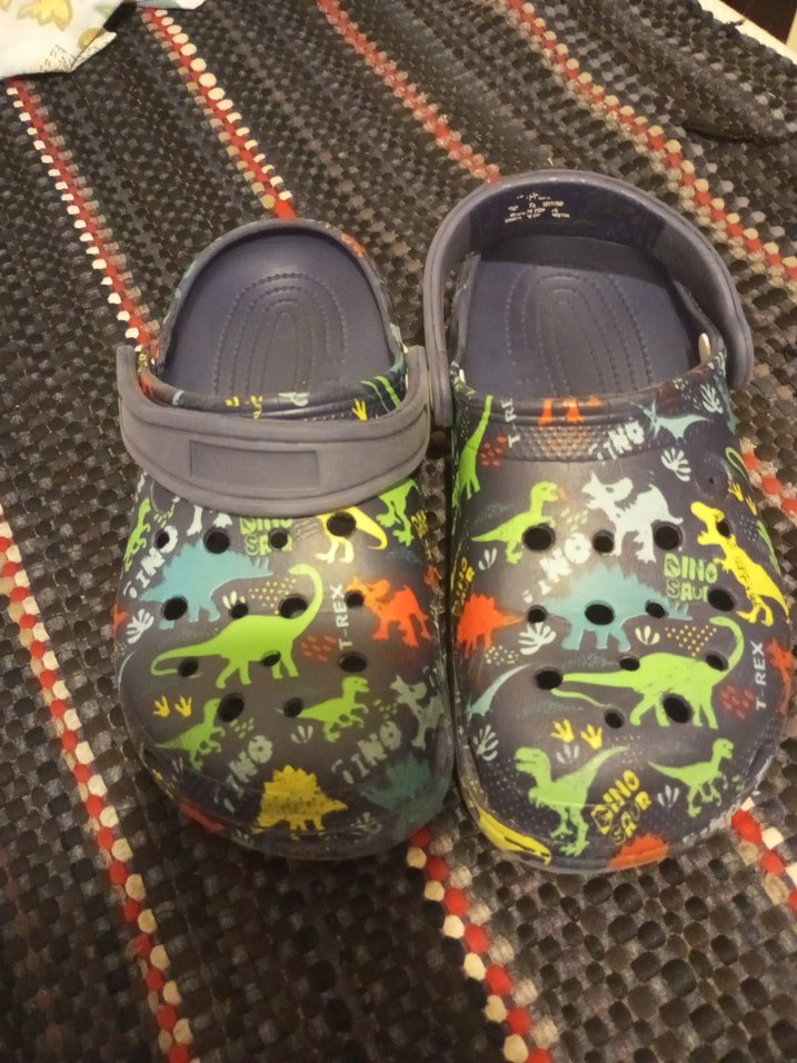 Erkek çocuklar için çok renkli dinozor desenli, kaymaz tabanlı kauçuk terlik, tokalı bantla desteklenmiştir. son resimde defosu belirtilmiştir giymeye engel yoktur sadece bant takılmadan kullanılır