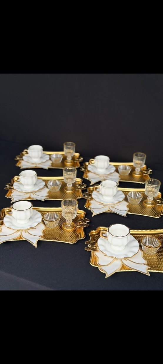 Altın detaylı tepsiler üzerinde beyaz kahve fincanları, şeffaf bardaklar ve küçük kaselerden oluşan set. ☕ 36 parça fiyonklu kanvas full kahve sunum seti Ptt kargo Mng kargo
