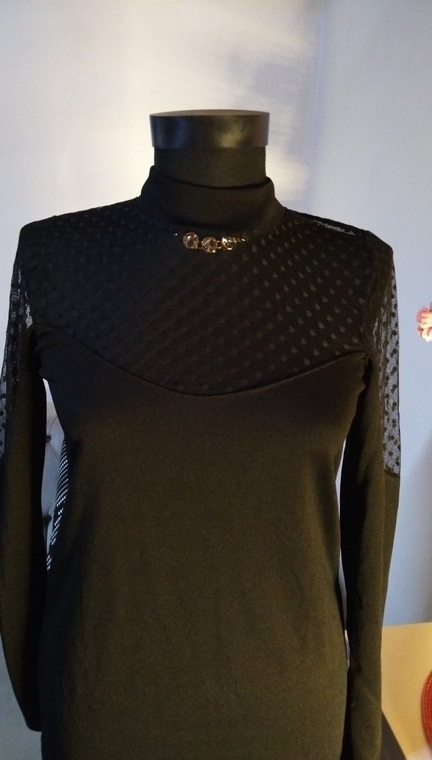 36/S beden boy 85 cm, Yüksek yakalı, uzun kollu siyah gotik kadın elbise. Örgü dokusu ve düz koyu renkte, rahat kesimli.