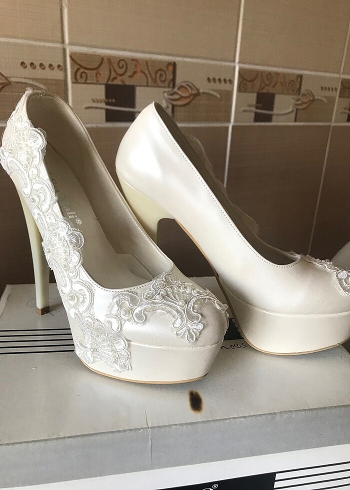 Düğünümde nikahta sadece giydim temiz. benim ayaklar çok ince olduğu için iç kısma ek parça koyuldu o sebepleh bir tekin içten ince tabanı kalkık yapıştırılabilir ben bilerek yapıştırmadım giymeye asla engel değil ÖZEL YAPIM dantelleri gelinlikle uyumlu yapıldı .iade yok. 37 numara . ölçüleri topuk :14cm platform: 4cm