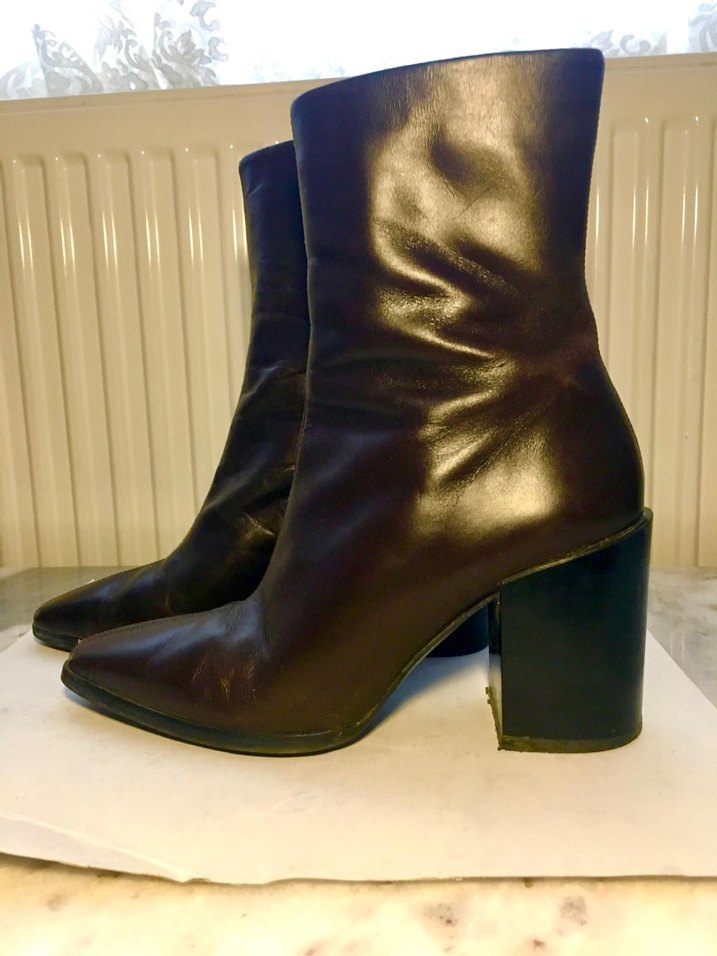 Zara 37 Numara, Kahverengi, Blok Topuklu Bot. Orjinal Zaradır. Topuk uzunluğu 8cm. Burun ve topuk kısımlarında hafif renk değişikliği vardır Koyu kahverengi deri kadın botları, blok topuklu ve desen içermeyen şık tasarım, ofis kullanımı için uygun.