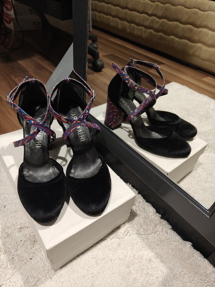 Arzu Yalhı tasarımı 37 numara üstü siyah kadife topuklu ayakkabı. Topukları ve kayışları çok renkli, bohem desenli, topuklu ayakkabı. Yalnızca 2 kere giyildi. Ayakta duruşu son görselde mevcut. Topuk=9.2 cm.