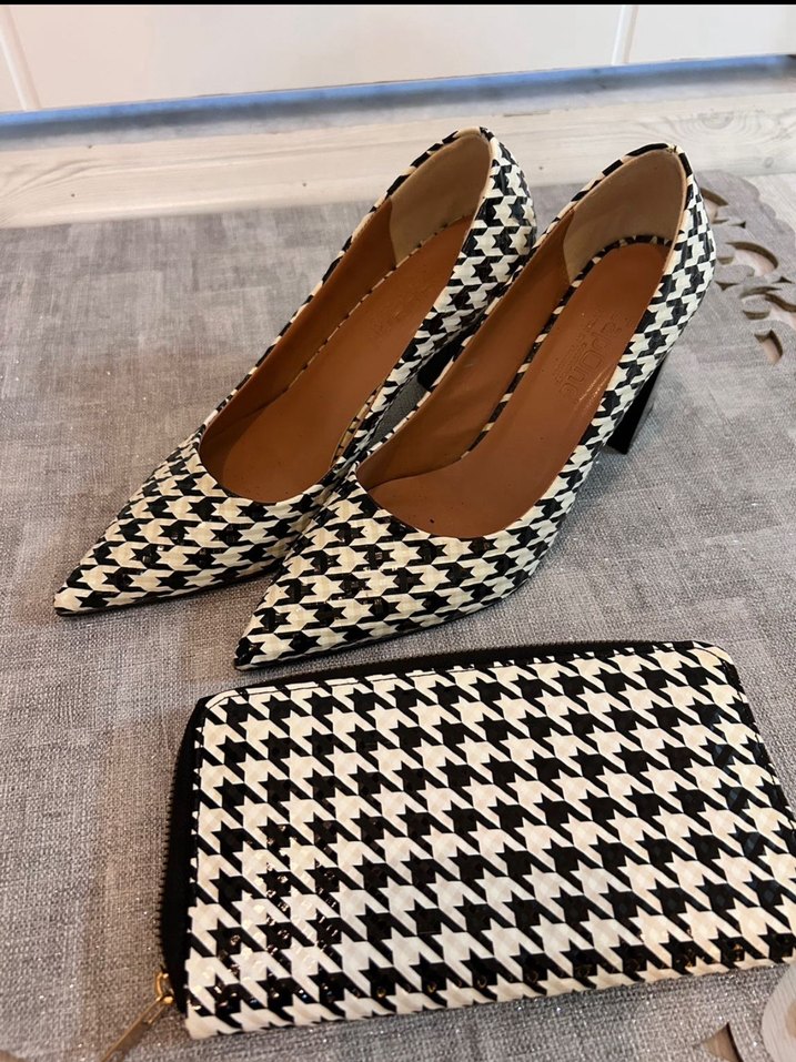 37 numara kaz ayağı Desenli Beyaz Stiletto ve Cüzdan Seti