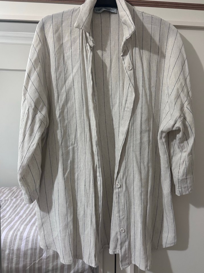 Sadece 1 kez kullanıldı . Gömlek geniş şort normal kalıptır . 38 beden keten alt üst takım
