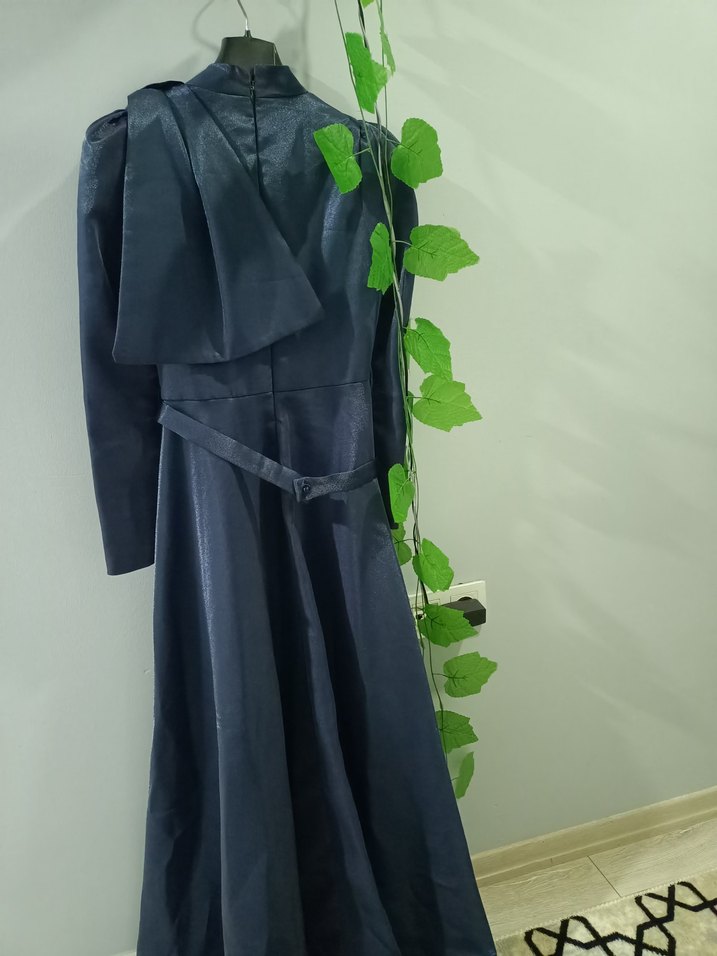 İki kez giyildi, 38 beden, hatası yoktur Lacivert renkli, uzun kollu ve drapeli, modest goth tarzında, ofis kullanımı için uygun uzun elbise.