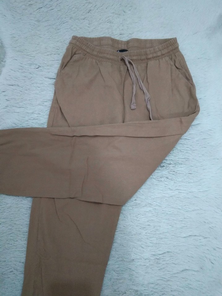 Sütlü kahve renkli, keten kumaştan, rahat kesimli ve bağcıklı bel detaylı kadın pantolon. Günlük kullanıma uygun ve temizdir ürün Boyu 93cm,basen 51cm dir