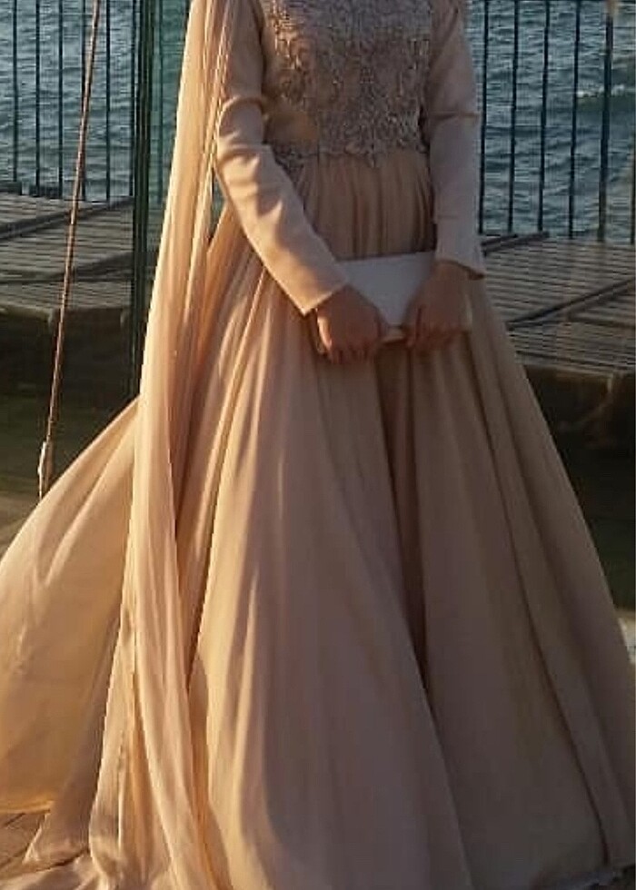 Mezuniyet balom için aldığım kolları tüllü hafif kabarık duran uzun elbise. Tesettür abiye denince en iyi markalardan olan Hennin marka, 38 beden. Ben altına topuklu giymediğim için uzun geldi boyu astarına takıldım iç astarında hafif yırtık vardı.