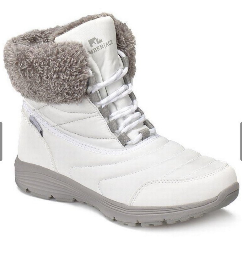 38 numara Lumberjack biraz kirli sadece..Gri tüylü detaylı, beyaz kadın botu. Yumuşak ve sıcak kumaştan yapılmış, dolgu topuklu, günlük kullanıma uygun rahat bir model.
