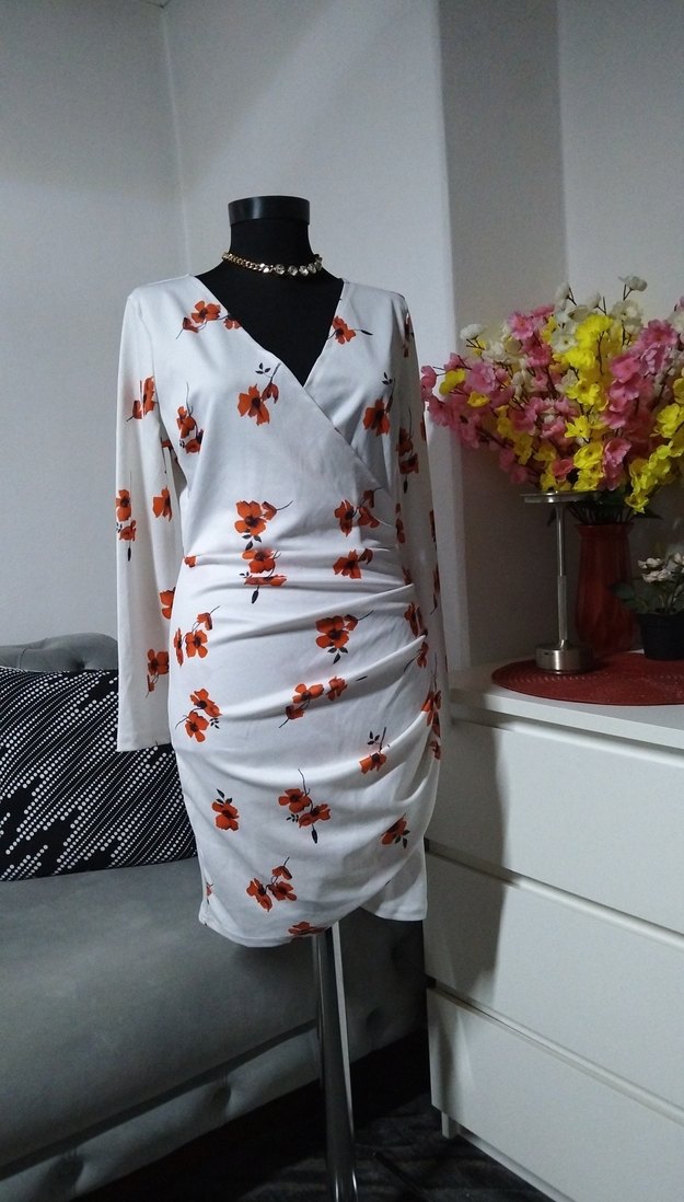38/M beden boy 90 cm, esnek kumaş, V yaka ve uzun kollu, çiçek desenli beyaz elbise. Drapeli ve vücuda oturan kesimi ile günlük rahat şıklık sunar. Midi boyda.