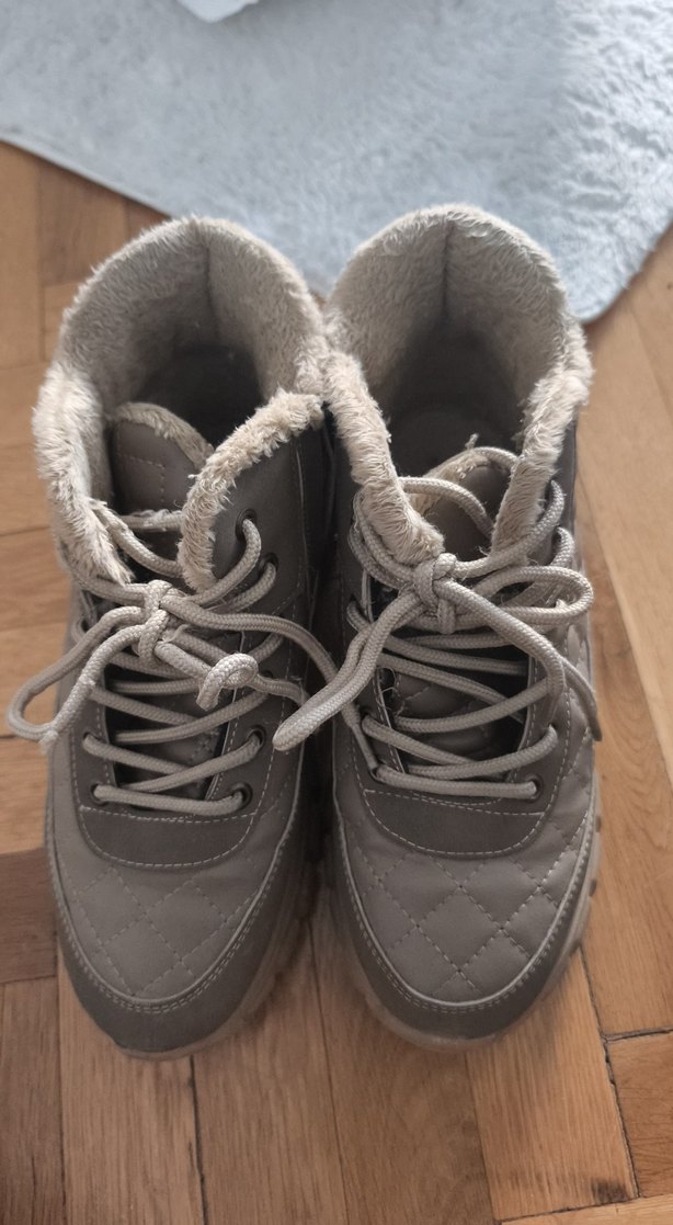 defosuz Gri malzemeden, içi tüylü ve dolgu topuklu kadın botu. Sokak tarzı ve günlük kullanım için uygundur.
