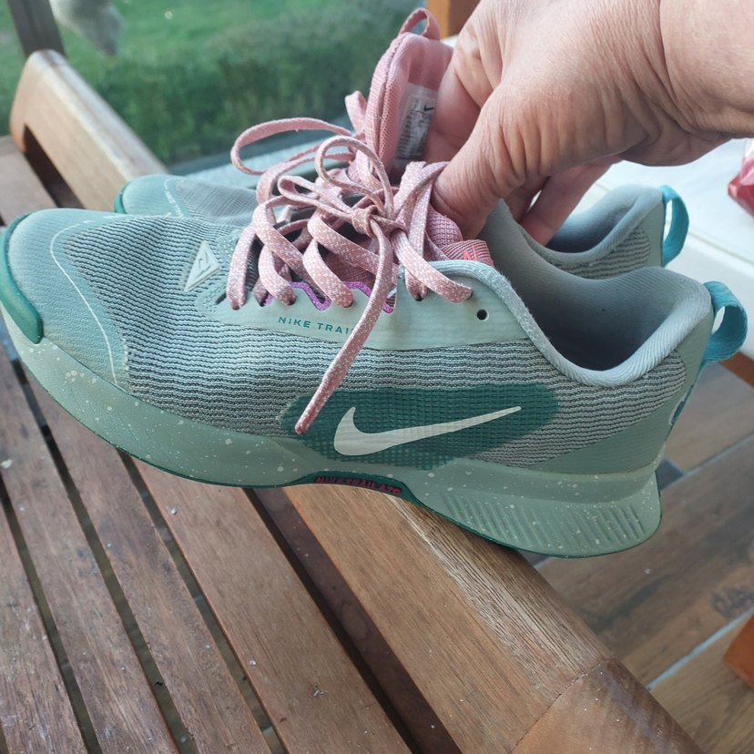 Nike markalı, turkuaz renkte, bağcıklı spor ayakkabısı. Pastel pembe bağcıklar ve batik desenli, rahat tabanlı.