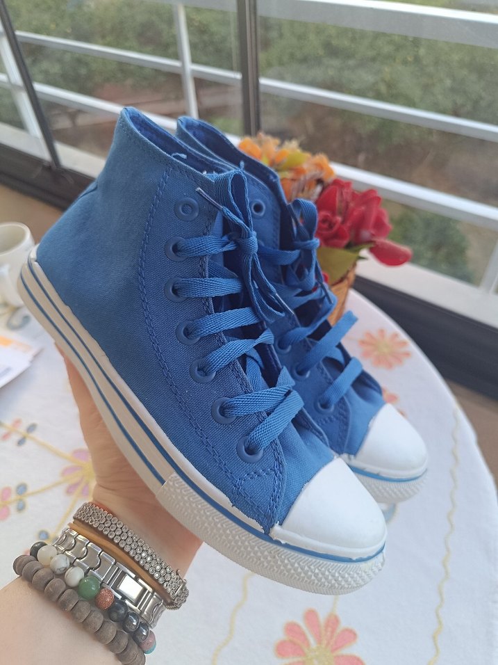 Mavi denim kumaştan yapılmış, bağcıklı spor ayakkabı günlük kullanım için uygun. Dolapta unutulan ayakkabılardan hiç kullanilmadi dıştan tertemiz fakat beklemekten kaynaklı iç astar altı yıpranmış son fotoda mevcut. #converse #39spor