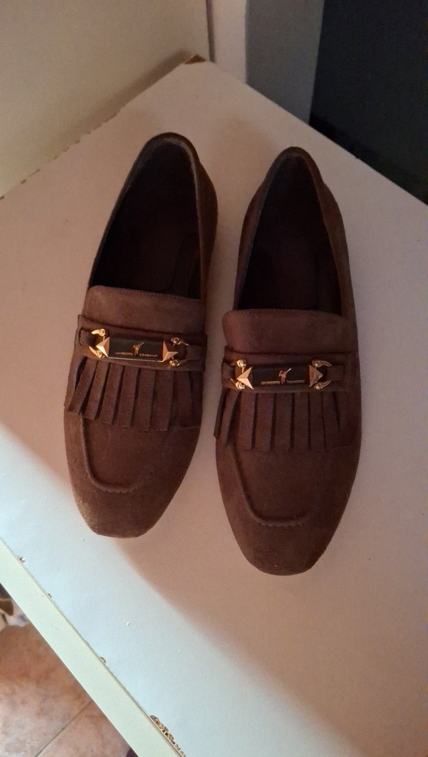 Haki süet, tokalı, blok topuklu kadın loafer. Hiç kullanılmadı tertemiz