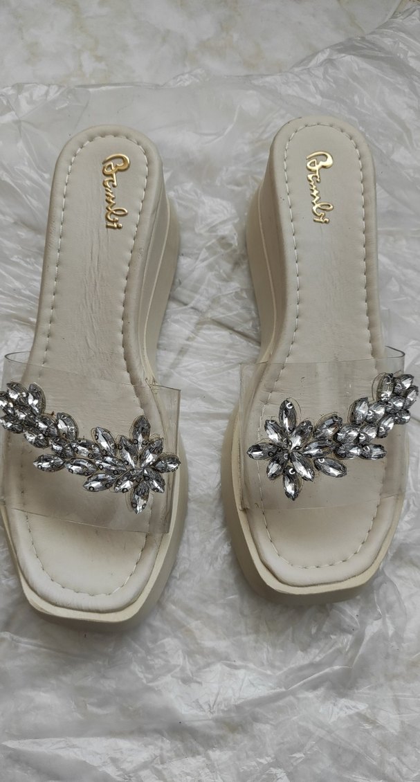 Beyaz dolgu topuklu kadın terlik, payetli ve nakış desenli. Kauçuk malzemeden, parlak görünümde, düğünlere uygun. Marka: Bambi merhaba bir iki defa az ve temiz kullanıldı ayrıntıları ile fotoğrafladım inceleyin lütfen numarası 39 iç uzunluğu 24 cm