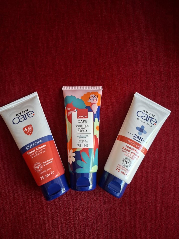 Avon Care el kremleri, 75 ml tüpte üç farklı çeşitte. Gliserinli, yatıştırıcı ve onarıcı formüllerle el bakımı sağlar.