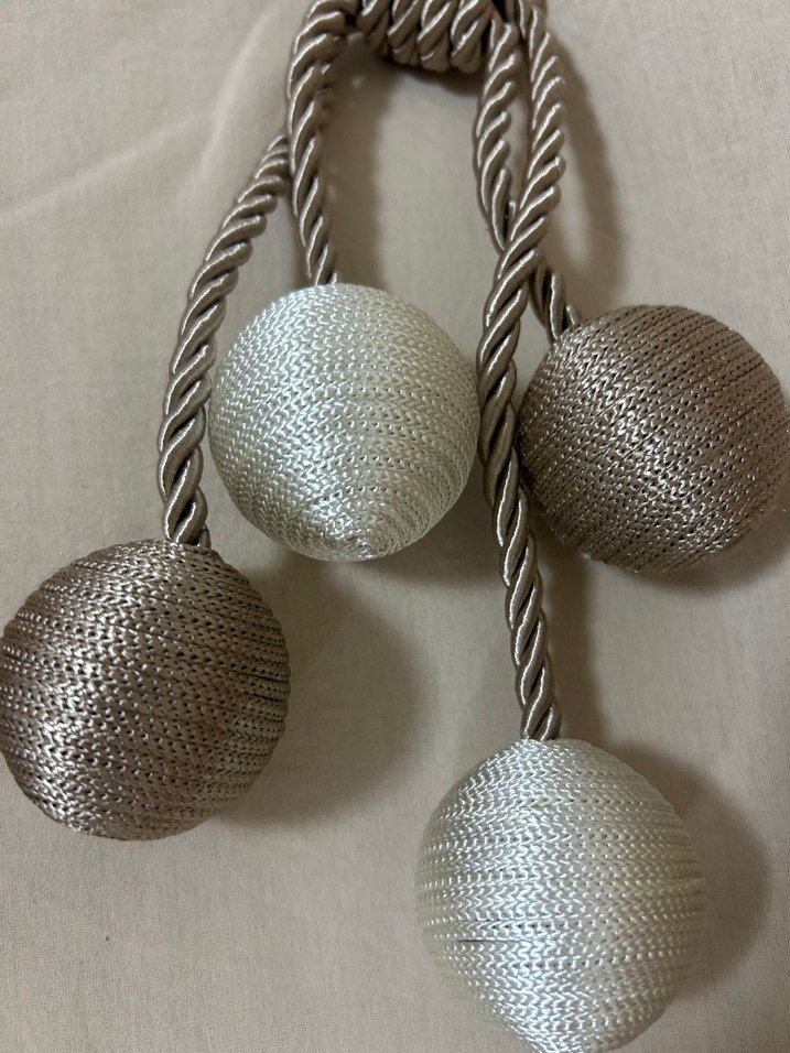 Hiç kullanılmadı. Sorunsuz. Nakışlı bej ve gri yuvarlak uçlu, bükümlü ip detaylı geleneksel perde bağlama ipi. 3b üçbey 4 Toplu Fon Perde Toplama Aparatı Kornise Takmatik Vizon Tavan Braçolu Perde Süsü
