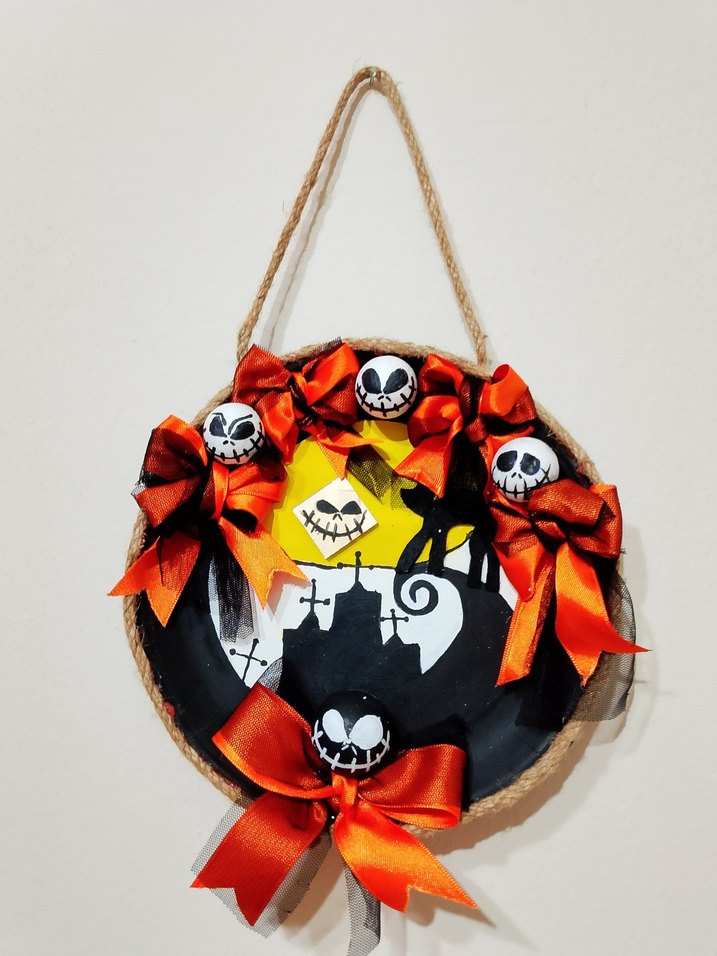 The Night Mare Before Christmas Temalı 3D Cadılar Bayramı duvar süsü, parlak turuncu fiyonklar ve kafatası detaylarıyla sezonluk dekor için uygundur ️.