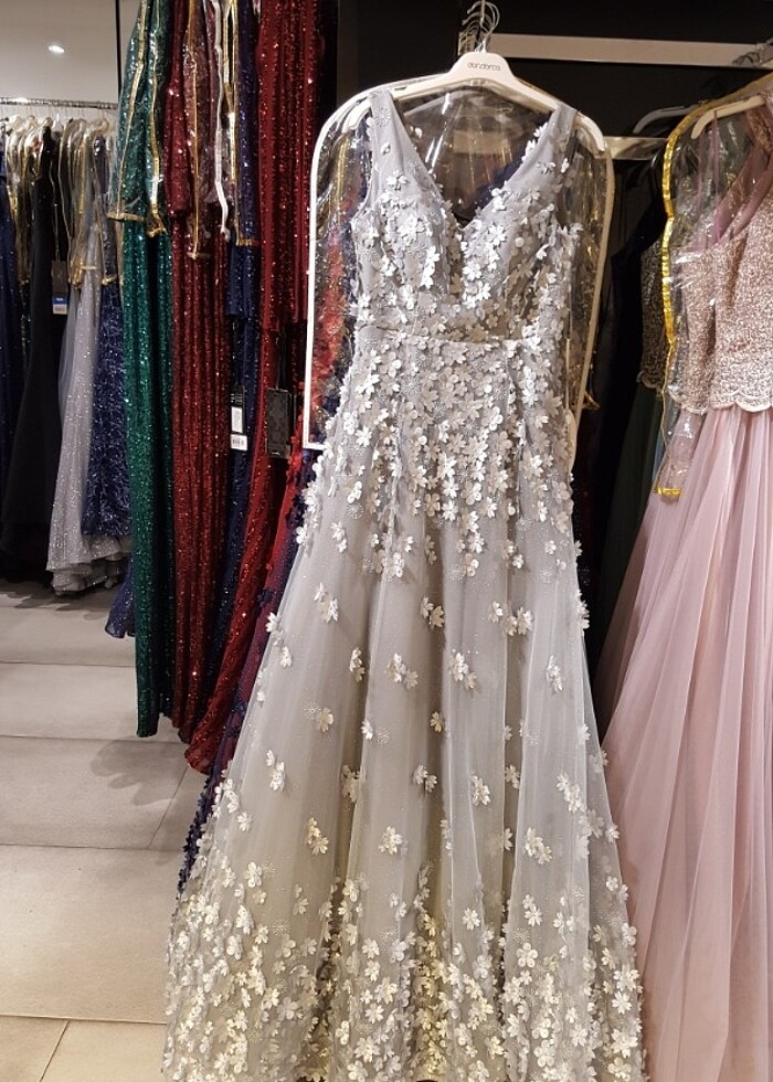 Nişan için 1 kere giyildi hiçbir yırtık sökük yok gri olan elbisedir tasarım bir elbise ver 3 boyutlu çiçekleri var üstünde