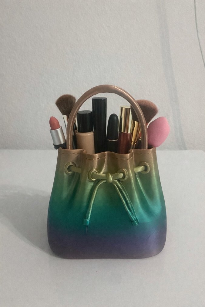 3D yazıcı ile üretilmiş, şık çanta formunda çok amaçlı organizer. Kalemlik, çiçeklik veya makyaj malzemelerinizi düzenlemek için rahatlıkla kullanılabilir. Modern tasarımı ve estetik görünümü sayesinde masa, ofis, makyaj masası ve raf dekorasyonuna uyum sağlar. Hafif ve dayanıklı yapısıyla hem kullanışlı hem de dekoratif bir üründür.