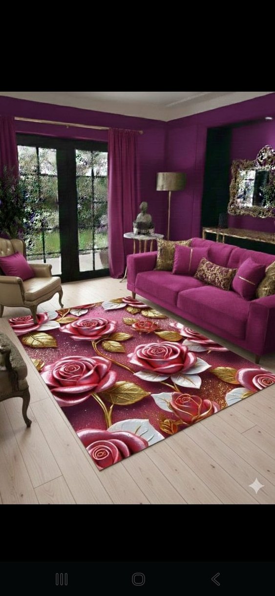 Canlı renklerde çiçek desenli, detaylı güller ve yapraklar içeren bordo modern halı, mekâna hareket katıyor. 3d dijital baskılı tasarım halılar farklı modeller mevcuttur