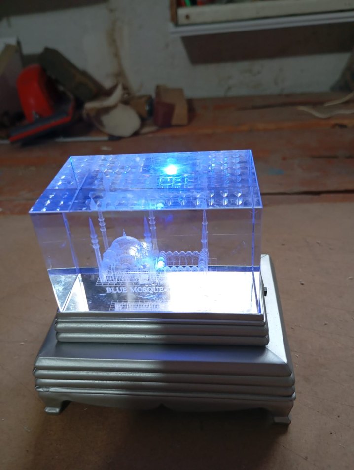 Şeffaf küp içinde cami tasarımı bulunan, ışık yayan küçük bir biblo, gümüş renkli taban üzerinde yer alır pille çalışır. ürün ışıklı olarak hiç kullanılmadı sıfır durumdadır. Alt sandık uzunluk 10 cm eni 8 cm , camlı camili kısım ile birlikte yükseklik 10 cm.