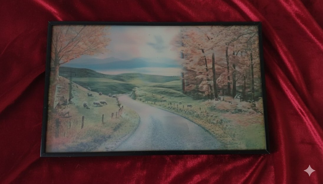 Bu tablo, yeşil tarlalar ve camel renkli ağaçlar arasında kıvrılan bir yolun olduğu pastel bir manzara sunuyor. Yumuşak renkler huzurlu bir atmosfer yaratıyor. aynı çerçeve içerisinde iki farklı resim