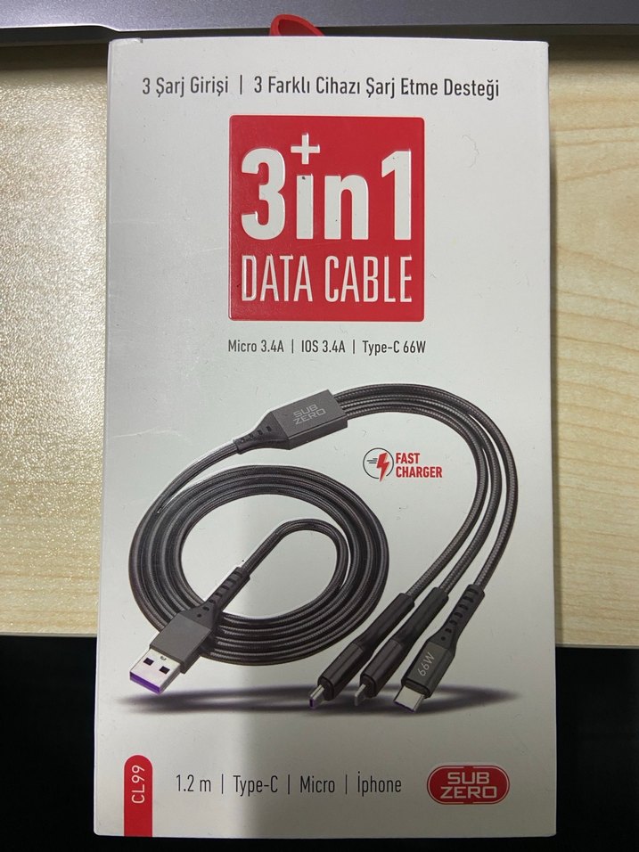 3in1 veri kablosu, Micro, iPhone ve Type-C ile 3 farklı cihazı hızlı şarj eder. 1.2 metre uzunluğundadır. ⚡