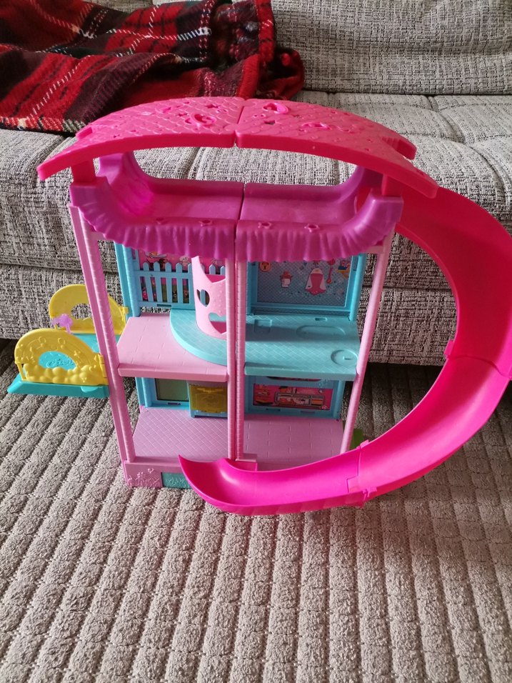Pastel pembe renkte, çok katlı plastik oyuncak ev. Eğlenceli oyun için kıvrımlı kaydırağı bulunur. 3 katlı havuzlu kaydıraklı ev en alt katta mutfak fırın