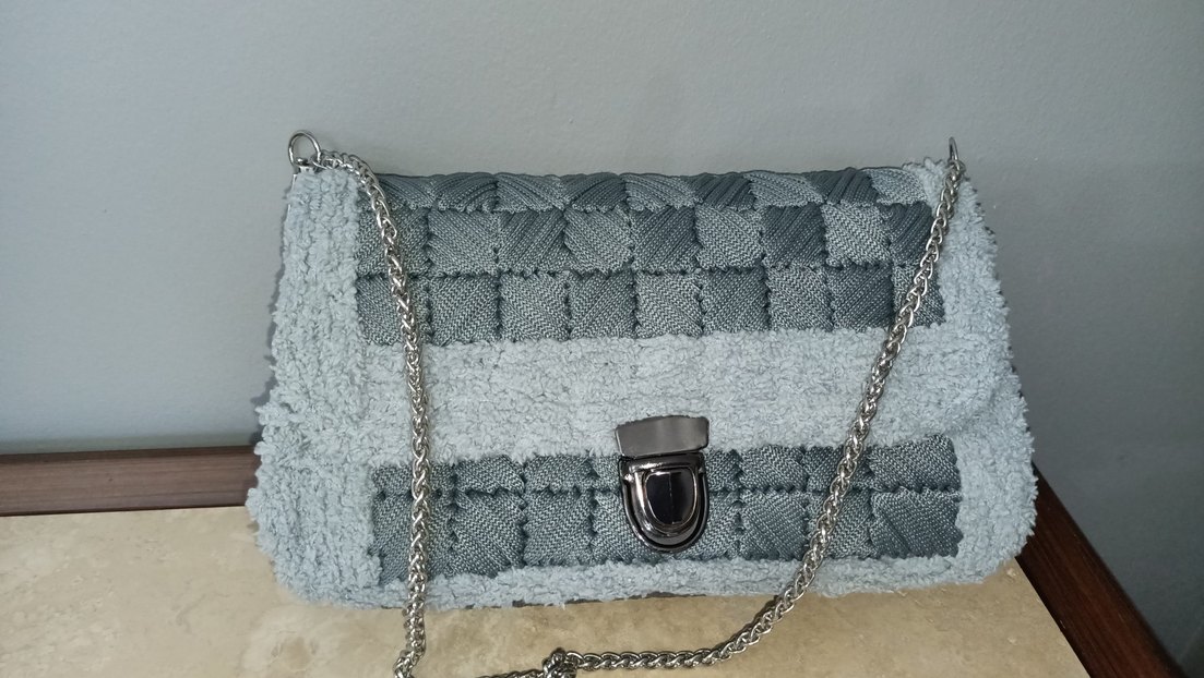 Gri tonlarda, örgü iç ve dış dizaynı astarı dikimi kendime ait, zincir detayına sahip kadın çantası. Günlük kullanıma uygun, desen içermeyen modern bir tasarım.