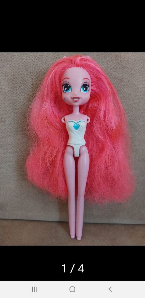 Uzun pastel pembe saçlı, göğsünde turkuaz kalp olan beyaz kıyafetli bebek. Büyük mavi gözlü ve gülümseyen yüz ifadesi var.