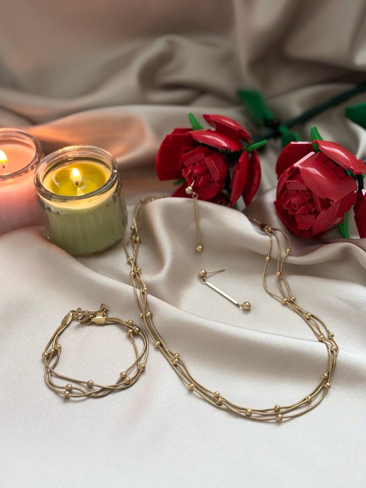 3’lü set halinde Dorika Gold set. 1 Adet Kolye 1 Adet Bileklik 1 Adet Küpe Minimalist ve bohem stil için uygun, günlük kullanıma ideal. Kolye ve Küpe de hiç bir sıkıntı yok sadece Bilekliğin topları kolyenin yanında kararmış gibi duruyor. Resimlerde de belli zaten
