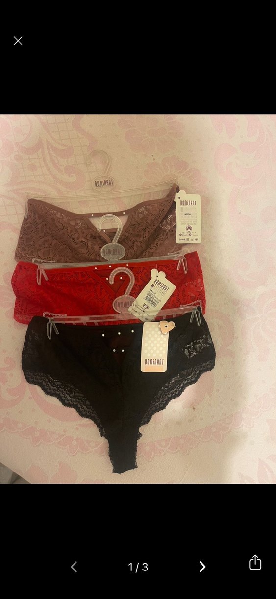 Kırmızı, siyah ve kahverengi renkte üçlü kadın dantelli mini külot seti. Her parça kısa ve rahat kesim ile ince dantel detaylarına sahip. Rahat ve gotik tarz için uygun.