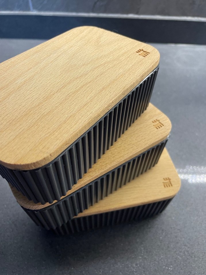 Orijinal ahşap kapaklı, gri renkte üst üste konabilir saklama kapları. Hiçbirinde hasar veya kırık yoktur. Kullanımı rahat ve şıktır.
