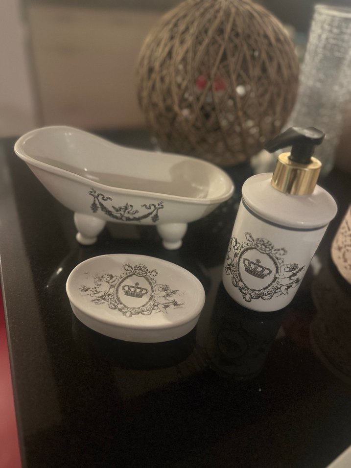 Gri siyah desenli porselen sabunluk seti. Banyo ve mutfaklara şıklık katar.