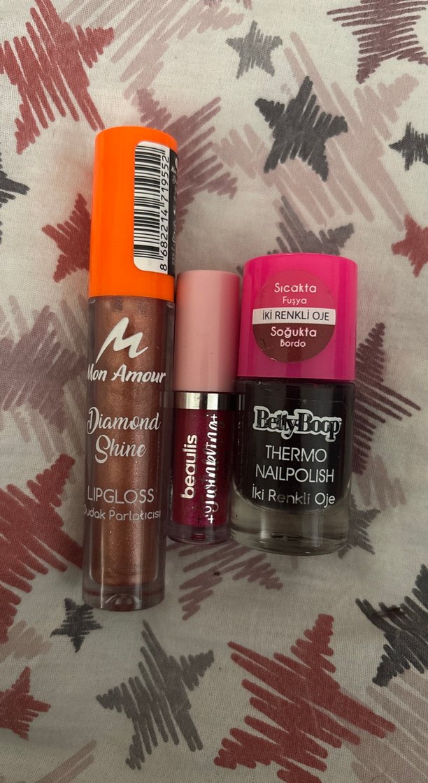 Mon Amour marka koyu pembe, ışıltılı lipgloss. Sıcaklıkla renk değiştiren iki renkli oje (fuşya-bordo) içerir.