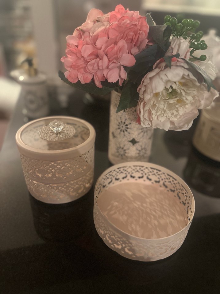 Bu set, zarif kesim desenlere sahip rose pastel metal düzenleyiciler içerir. Makyaj takı vb. düzenleyici veya dekoratif mumluk olarak çeşitli şekillerde kullanılabilir. Mekâna yumuşak bir atmosfer katar. Çiçekler dahil değildir.
