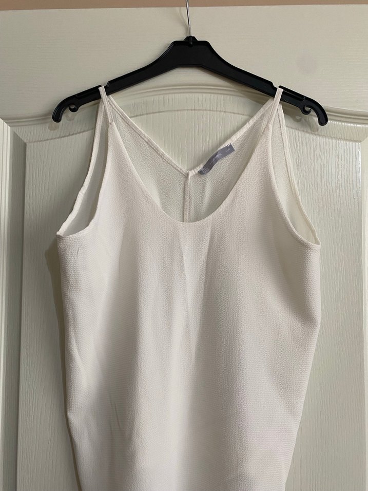 Nefes alabilen keten kumaştan, V yakalı beyaz kolsuz kadın atlet. Salaş kesimi ve desen içermeyen minimalist tasarımıyla günlük sokak stiline uygun.