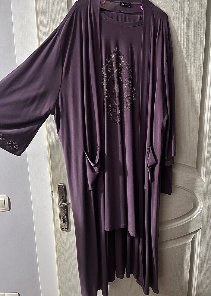 ürün hiç giyilmedi bedenime olmadığı için 3 parça olarak gönderiyorum pantolon ceket ve tuniğiyle (uzun kollu) 56 beden