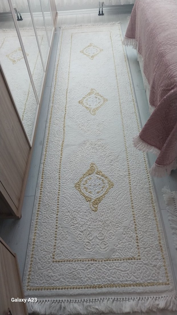 krem renkli, nakışlı desenli klasik yolluk halı, koridorlara zarif bir dokunuş sağlar. 3lü settir temiz sıfır ayarindadir