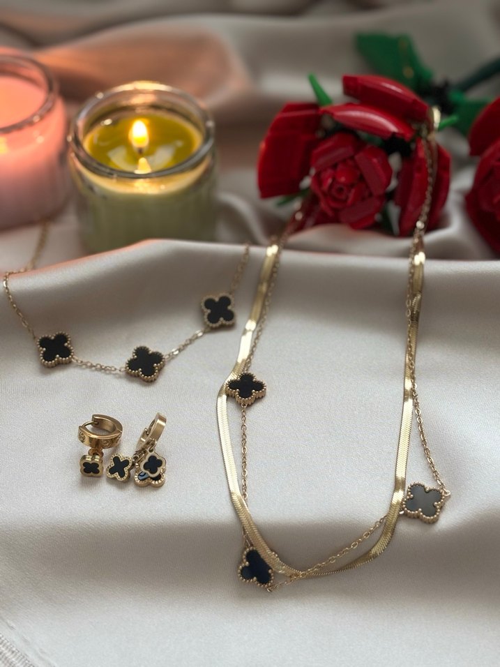 Siyah Çelik Siyah Yonca Set 1 adet İtalyan Zincirli Siyah Yonca Kolye 1 adet Siyah Yonca Bileklik 1 adet 3’lü siyah yonca küpe Fiyat set halindedir ayrı almak isterseniz mesaj atabilirsiniz