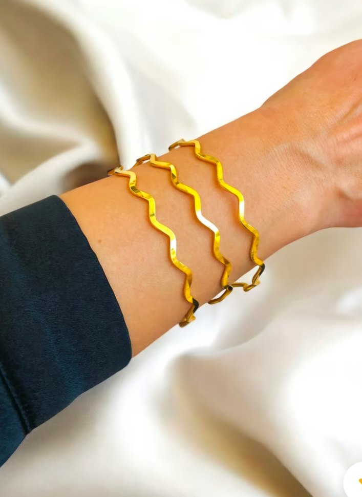 Altın renkli, dalgalı tasarımlı elastik bileklik. Günlük kullanıma uygun, çağdaş ve minimalist tarzda.