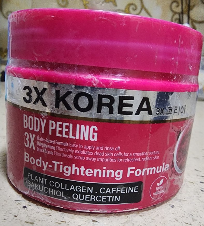 Bitkisel kollajen, kafein, bakuchiol ve kersetin içeren 3X Korea vücut peelingi. Ölü deri hücrelerini nazikçe arındırır, cildi sıkılaştırır ve yeniler.