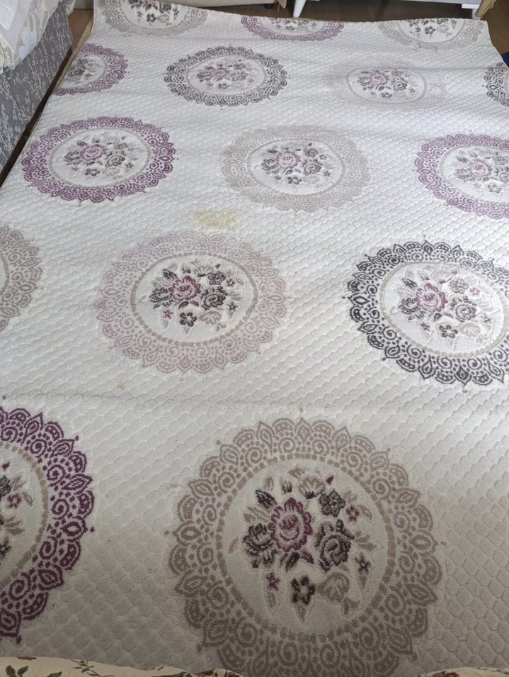Hafif mor renkli, geleneksel çiçek desenli, dairesel motiflere sahip dokulu yüzeyli halı.