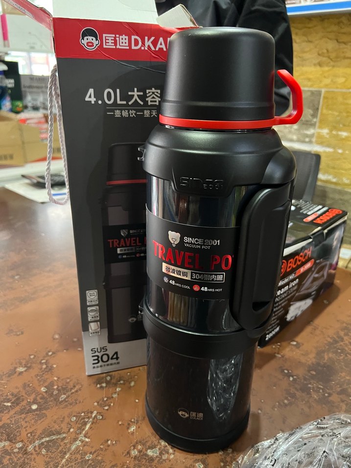 4.0 litre büyük kapasiteli, saplı ve kapaklı siyah çocuk termos şişesi. Sıcak içecekler için uygundur.